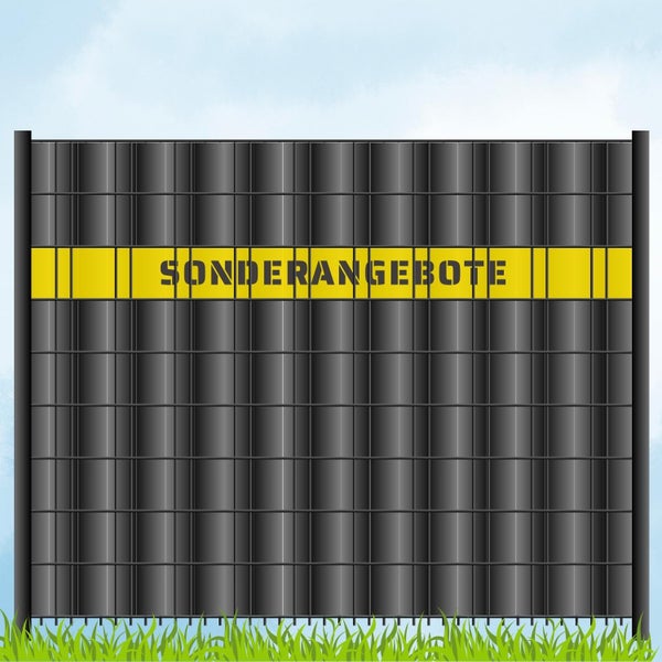 Der Schriftzug SONDERANGEBOTE wird direkt aus dem Material herausgelasert – eine wetterbeständige und langlebige Alternative zu herkömmlichen bedruckten Sichtschutzstreifen. Mit verschiedenen Farben zur Auswahl kannst du deinem Zaun ein individuelles und professionelles Erscheinungsbild verleihen.