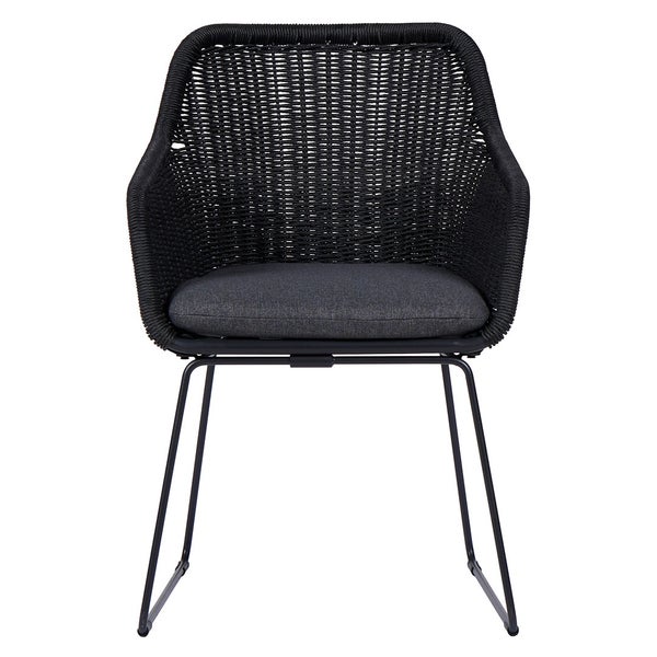 Dieser Outdoor-Stuhl vereint Komfort und Stil mit seinem modernen Geflecht und dem soliden Metallgestell. Das bequeme Kissen sorgt für zusätzlichen Sitzkomfort, während die gewebte Rückenlehne und Sitzfläche für einen stilvollen und natürlichen Look sorgen. Der robuste Metallrahmen sorgt für Langlebigkeit, wodurch sich der Stuhl sowohl für den Innen- als auch für den Außenbereich eignet.