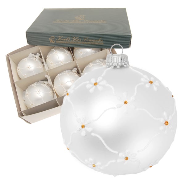 Silber matt 8cm Glaskugel mundgeblasen und handdekoriert mit kleinen Blumen in weiß und gold (6 Stück), 6 Stck., Weihnachtsbaumkugeln, Christbaumschmuck, Weihnachtsbaumanhänger