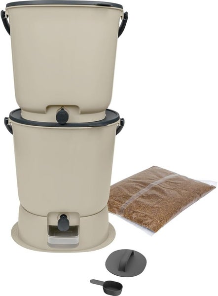 - Lieferumfang: 2 x Eimer, 1 x EM-Aktivator 1 kg, Zubehör (1 x Tassenwerkzeug, 2 x Sieb, 1 x Messlöffel zum Einsetzen des Aktivators, 1 x Behälter zum Auffangen der Gärflüssigkeit), 1 x Basis, 1 x Bedienungsanleitung (evtl. nicht in deutscher Sprache).