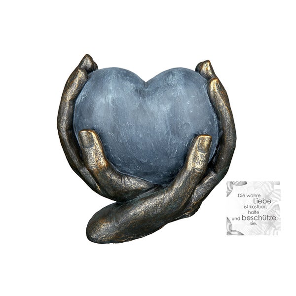 Ein Herz im Verborgenen kommt zum Vorschein, wenn die Fassade bröckelt. Die Skulptur Herz in Händen fängt diesen besonderen Augenblick ein. Die bronzefarbenen Hände halten das graue Herz wie einen schützenden Mantel. Das Herz symbolisiert Liebe und zwei Hände vermitteln Geborgenheit. Die Figur ist aus dem Kunstharz Polyresin gefertigt und somit äußerst widerstandsfähig und leicht zu reinigen. Diese Skulptur ist ein Dekorationselement mit individueller Interpretation für den Betrachter. Es fügt sich problemlos in eine bereits vorhandene Dekoration ein oder fordert als Solist die Aufmerksamkeit.