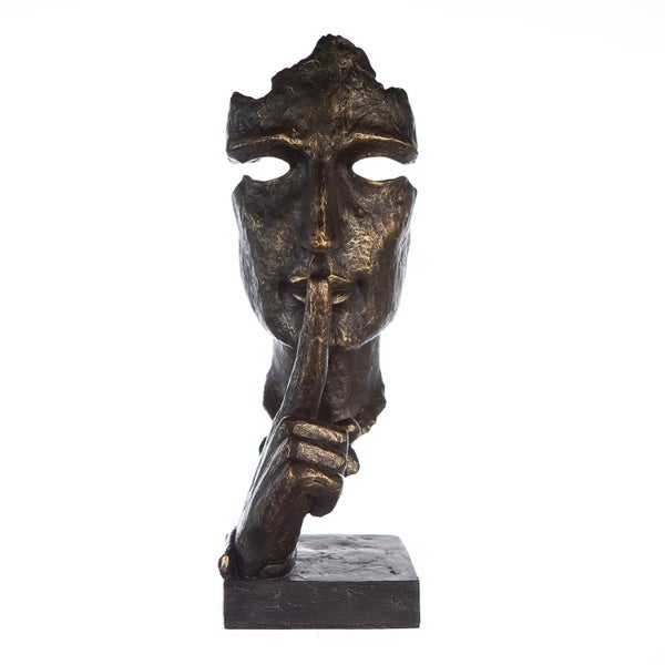 Manchmal ist Schweigen die beste Antwort. Mit diesem Spruchanhänger ist die Skulptur Silence versehen. Sie ist aus dem Kunstharz Polyresin hergestellt und somit äußerst widerstandsfähig. Das bronzefarbene Gesicht mit Hand erhält auf der grauen Basis einen festen Stand. Sie wird durch ihre Oberflächenstruktur zum einzigartigen Blickfang. Diese Skulptur ist eine Dekoration mit Symbolcharakter und ‚Tiefgang‘.
