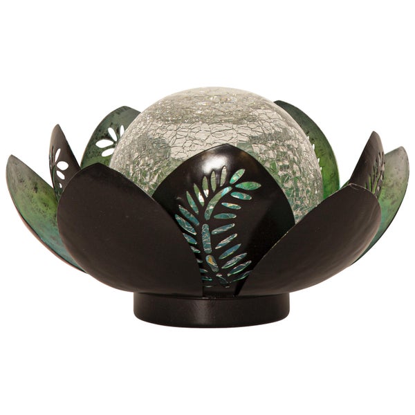 - Die LED-Solar-Dekoration zeigt eine Seerose mit weiß-blauer Glaskugel in der Mitte, welche aus silber-blauem Metall besteht. Durch die Cut-Outs in den Blüten entsteht ein faszinierendes Licht- und Schattenspiel in der Umgebung