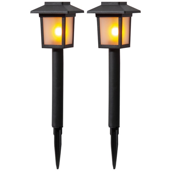 - Die 2 LED-Solar-Wegeleuchten bestehen aus einem schwarzen Erdspieß mit klassischer Laternen-Spitze