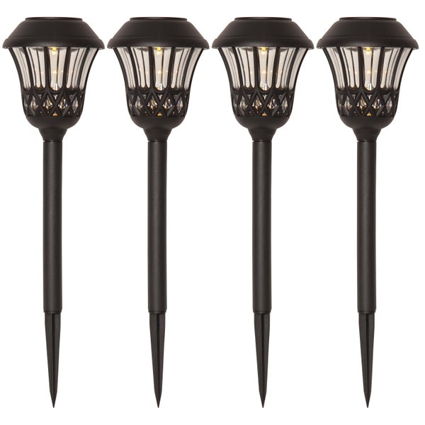 - Die 4 LED-Solar-Weglampen bestehen aus einem Erdspieß aus schwarzem Kunststoff mit einem modernen Glas-Leuchtenkopf und Kunststoff-Details