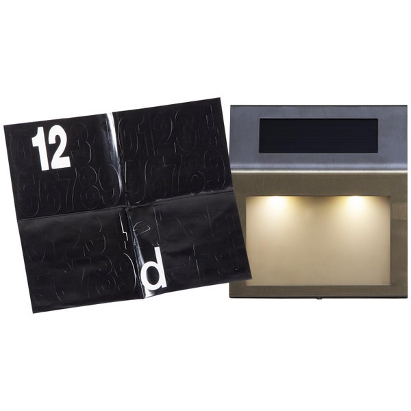 - Die LED-Solar-Wandlampe hat einen dreieckig abgeschrägten Leuchtenkörper, an dessen Unterseite sich das Leuchtmittel befindet. Durch die Aufkleber der Nummern 0-9 sowie den Buchstaben a-n kann die eigene Hausnummer im Dunkeln sichtbar gemacht werden