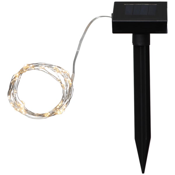 - Die LED-Solarlichterkette besteht aus einem 5 Meter langen silberfarbenen Kabel mit integrierten LEDs, an dessen Ende sich der schwarze Erdspieß mit Solarpanel befindet