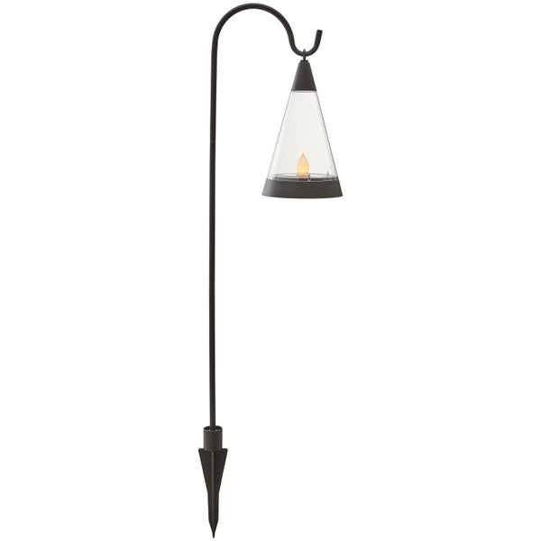 - Die LED-Solardekoration besteht aus einem schwarzen Erdspieß aus Kunststoff und gebogener Spitze, an der sich der kegelförmige Leuchtenkopf befindet. Der Kegel kann flexibel eingesetzt werden. Entweder an dem mitgelieferten Erdspieß oder eigenständig aufgehängt an einem Ast oder aufgestellt auf einem Tisch