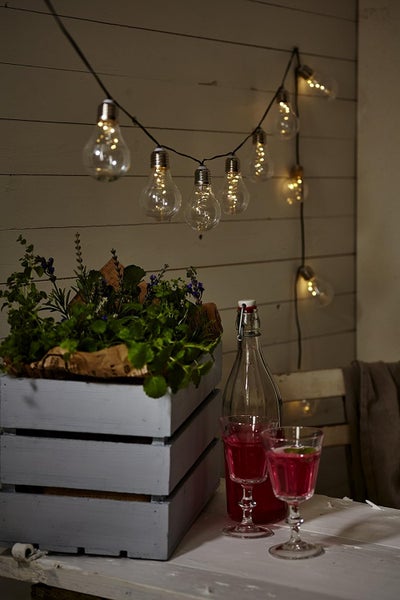 - Die Lichterkette besteht aus 10 durchsichtigen LED Glühbirnen in klassischem Design an einem 1,8 Meter langem Kabel und im Inneren sichtbarer Tautropfen-Lichterkette