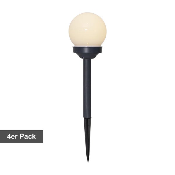 - Das Solarpoller-Set besteht aus vier Leuchten mit schwarzem Stab, auf dem sich der kugelförmige, weiße Leuchtenkopf befindet
