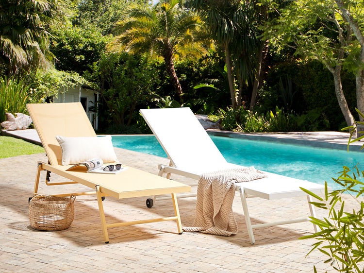 Elegante Sonnenliege mit verstellbarer Rückenlehne. Nehmen Sie ein Sonnenbad auf den bequemen Liegestuhl, wo Sie nur möchten. Die beiden Rollen ermöglichen, die Gartenliege zu transportieren und schnell an den gewünschten Platz zu verstellen. Um den besten Sitz- oder Liegenkomfort zu gewähren, ist die Rückenlehne leicht regulierbar und lässt sich so auf die Bedürfnisse des Benutzers anpassen. Das pflegeleichte Material in dezentem weißem Farbton definiert modernes Design und betont die praktische Seite der Liege, sowie ihre moderne Ausstrahlung. Details: Typ Gartenliege. Stil: Modern. Farbe: Weiß. Gestellfarbe: Weiß. Material: Metall. Material: Aluminium. Zusätzliches Material: Textil. Zusammenstellung: 70% PVC. Verstellbare Rückenlehne: Ja. Verstellbar: Rückenlehne. Armlehnen: Nein. Finish: Pulverbeschichtet. Zusammenklappbar: Nein. Abmessungen: Tiefe: 65 cm. Sitzhöhe: 32 cm. Breite: 198 cm. Höhe: 32-107 cm. Gewicht: 8 kg. Max. Belastung: 120 kg. .Sie kaufen: 1 x Gartenliege. Produktvorteile: Rückenlehne verstellbar in 5 Positionen, Leicht transportierbar dank der Rollen, Stabile und solide Konstruktion, UV-Beständigkeit Klasse 5 (ISO 105-B02), Witterungsbeständiges und schmutzabweisendes Material. Montage: Nicht montiert.20 - 40 Min. Beständigkeit: Wasserbeständig, UV-beständig, Rostbeständig. Beständigkeit Text: UV-strahlenbeständige Möbel weisen eine erhöhte Beständigkeit gegen Verblassen oder Verfärbung auf. Wir empfehlen jedoch, dass Sie das Produkt bei Nichtgebrauch abgedeckt aufbewahren. Dies gewährleistet die maximale Lebensdauer der Möbel. Dank eines entsprechenden Finish zeichnet sich das Produkt Oberfläche durch eine Rostbeständigkeit aus. Dies bedeutet, dass es im Freien genutzt werden kann. Werden die Möbel nicht genutzt, sollte entweder eine Abdeckung verwendet oder sie sollten an einem trockenen Ort gelagert werden. Dieses Produkt zeichnet sich durch eine hohe Wasserbeständigkeit aus. Dies bedeutet, dass es in Kontakt mit Regen oder anderen Flüssigkeiten nicht beschädigt wird. Sie können das Produkt im Freien, auch bei Regen oder einer hohen Luftfeuchtigkeit nutzen. Außerhalb der Saison sollte das Produkt bedeckt und an einer abgedachten Stelle aufbewahrt werden. Pflegeanleitung: Textil: 1.Die Reinigung kann mit handelsüblicher milder Seifenlauge und einem weichen Tuch erfolgen. 2.Die Verwendung eines Grills in der Nähe des Möbelstücks sollte mit grösster Vorsicht geschehen, da Funken der Holzkohle stellenweise Beschädigungen verursachen können. Legen Sie aus diesem Grund auch keine heissen Grillzangen und Spiesse auf die Tischplatte. 3.Das Material ist extrem witterungbeständig. Jedoch empfehlen wir für die Wintersaison eine Schutzhülle zu verwenden oder, wenn möglich, die Möbel trocken und kühl drinnen zu lagern. Aluminium: 1.Die Reinigung kann mit handelsüblicher milder Seifenlauge erfolgen, bitte dabei ausschließlich milde Reinigungsmittel verwenden. 2.Wir empfehlen für die Wintersaison eine Schutzhülle zu verwenden oder, wenn möglich, die Möbel trocken und kühl drinnen zu lagern.