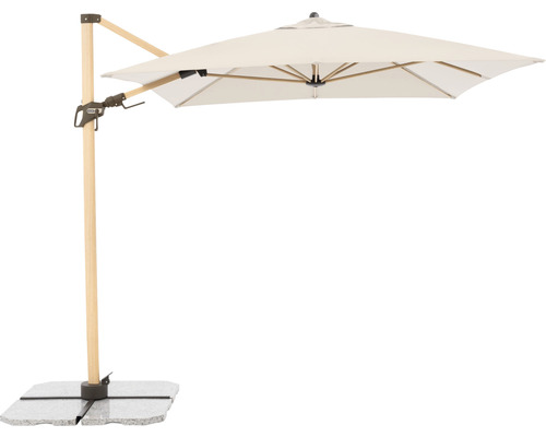 - ArtikelvorteilKurbel-Pendelschirm in Holzoptik, Schrägstellbar, 360° drehbar, Beidseitig axial schwenkbar, Große, rechteckige Schirmform, Lieferung inkl. Sockelkreuz (ohne Platten)