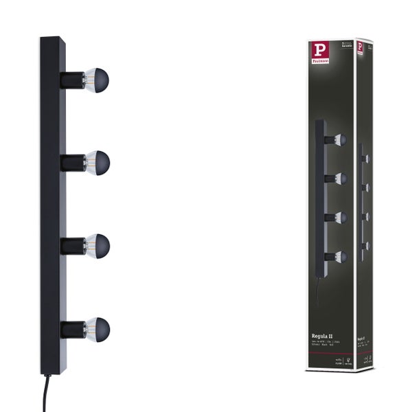 Die 4-flammige Regula II ist die ideale Wahl für eine dekorative Spiegelbeleuchtung. Sie wird mit einem praktischen Textil-Kabelschalter in der Farbe Schwarz geliefert, sodass die Montage zum Kinderspiel wird. Dabei wird nur eine Steckdose benötigt, ein Stromauslass an der Wand ist nicht weiter erforderlich. Mit ihrem modernen und cleanen Design in Schwarz fügt sie sich harmonisch in verschiedene Einrichtungsstile ein und ist optisch sowohl am Schminktisch als auch im Flur ein echter Hingucker. Die Länge von 60 cm ist an Standard-Spiegelmaße angelehnt. Durch den Einsatz verschiedener Leuchtmittel mit E14 Fassung, kann sie für den eigenen Anwendungszweck individualisiert werden. Für einen glamourösen Hollywood-Schminkspiegel-Look eignen sich insbesondere verspiegelte Lampen. Sie sorgen für eine blendfreie Beleuchtung und erzeugen attraktive Licht-Reflexionen. Ein modern-klassischer Look hingegen entsteht durch Verwendung opaler Leuchtmittel, die ein rundum strahlendes Licht abgeben. Die Installation der Regula II gestaltet sich denkbar einfach: Sie kann über oder neben dem Spiegel an der Wand montiert werden. Nach dem Eindrehen der gewünschten Leuchtmittel ist sie sofort betriebsbereit. Zur Reinigung der Leuchten eignet sich am besten ein weiches Tuch – auf die Verwendung eines Mikrofasertuches sollte verzichtet werden. Je nach verwendetem Leuchtmittel, ist die Lampe dimmbar.