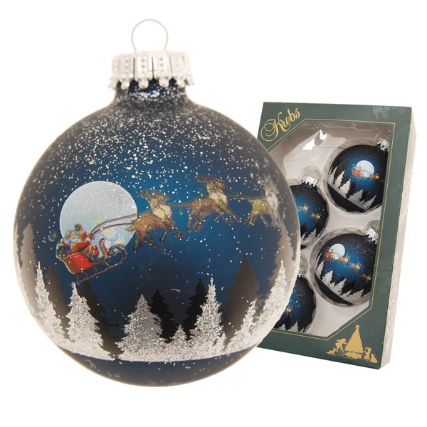 Erlebe die Magie von Weihnachten mit dem 4-teiligen Glaskugelset Spirit of Christmas! Verziere deinen Christbaum mit dem wunderschönen Motiv des Weihnachtsmanns auf seinem Schlitten, der von seinen treuen Rentieren durch den verschneiten Winterwald gezogen wird. Mit einer Größe von 7cm sind diese Kugeln der perfekte Blickfang für jeden Baum und schaffen eine gemütliche Atmosphäre in deinem Zuhause.Unser exklusives Glaskugelset Spirit of Christmas besteht aus insgesamt vier Kugeln, die alle mit dem gleichen, liebevoll gestalteten Motiv des Weihnachtsmanns auf seinem Schlitten verziert sind. Die dunkelblaue Farbe verleiht den Kugeln eine elegante Note und lässt sie besonders edel wirken. Jede Kugel hat einen Durchmesser von 7cm und ist somit groß genug, um als Blickfang auf deinem Christbaum zu dienen.Die hochwertige Verarbeitung der Kugeln sorgt dafür, dass sie langlebig sind. Du kannst sie also Jahr für Jahr verwenden und dich immer wieder an ihrem zauberhaften Anblick erfreuen. Das Set eignet sich auch hervorragend als Geschenk für Freunde und Familie, die sich ebenso wie du auf die Weihnachtszeit freuen.Das Spirit of Christmas Glaskugelset ist nicht nur ein wunderschöner Christbaumschmuck, sondern auch eine Erinnerung an die Freude und Magie, die Weihnachten in uns allen hervorruft. Lass dich von diesen Kugeln verzaubern und schaffe eine gemütliche Atmosphäre in deinem Zuhause, die deine Gäste begeistern wird.Bei der Herstellung unserer Glaskugeln achten wir auf höchste Qualitätsstandards und verwenden ausschließlich hochwertige Materialien. So kannst du sicher sein, dass du ein Produkt erhältst, das nicht nur schön, sondern auch langlebig ist.Unser Glaskugelset Spirit of Christmas ist der perfekte Christbaumschmuck für alle, die sich auf die Weihnachtszeit freuen und eine gemütliche Atmosphäre in ihrem Zuhause schaffen möchten. Mit seinem zauberhaften Motiv des Weihnachtsmanns auf seinem Schlitten und den treuen Rentieren, die durch den verschneiten Winterwald ziehen, versprüht es Freude und Magie. Die dunkelblaue Farbe und die hochwertige Verarbeitung machen es zu einem edlen Blickfang auf jedem Christbaum. Bestelle jetzt dein eigenes Set oder überrasche Freunde und Familie mit einem wunderschönen Geschenk, das sie noch lange an die Freude von Weihnachten erinnern wird.