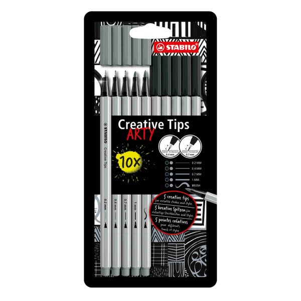Die STABILO Creative Tips sind durch die verschiedenen Strichstärken und Stiftspitzen vielfältig kreativ einsetzbar. Ob ein aufwändiges monochromatisches Kunstwerk oder bunte Letterings, die hochwertigen Stifte sind die perfekten Werkzeuge für Gestaltungen aller Art. Sie umfassen einen extrafeinen Fineliner mit 0,2 mm Spitze sowie zwei Fineliner mit gefederten Spitzen in 0,4 mm und 0,7 mm Strichstärke, einen robusten Filzstift mit 1 mm Strichstärke und einen Filzstift mit flexibler Pinselspitze. Die Premium-Auswahl ist in verschiedenen Sets mit verschiedenen Farbkombinationen erhältlich. Die Tinte aller Stifte ist wasserbasiert und aquarellierbar. So sind atemberaubende Effekte und Farbverläufe umsetzbar. STABILO ARTY ist für alle Kreativen, die es maximal bunt und abwechslungsreich lieben - egal ob Anfänger, Fortgeschrittener oder Profi. Entdecke die große Auswahl an Produkten mit unterschiedlichen Spitzen von Keilspitze bis Pinselspitze. Dank der verschiedenen Features der Produkte kannst du mit unterschiedlichen Techniken arbeiten und die Stärken der Stifte kombinieren, um Einzigartiges zu kreieren. Deiner Kreativität sind keine Grenzen gesetzt. Ob Bleistift, Buntstift, Brush-Pen oder Marker - jetzt bist du dran!