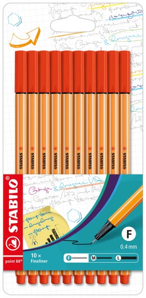 STABILO® point 88®. Der universelle Fineliner für Schüler, Studenten und Profis. Europas Fineliner Nr. 1. Einzigartige Sechskantoptik mit Streifendesign. Metallgefasste Spitze für lange Lebensdauer. Strichstärke 0,4 mm. Für feines Schreiben, Zeichnen und Skizzieren. Lineal- und schablonengeeignet. Hoher Austrocknungsschutz ohne Kappe. Kappe am Stiftende aufsteckbar.