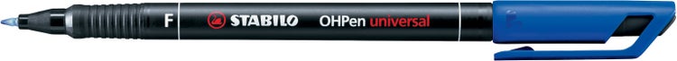 Folienstift STABILO® OHPen universal. Typbezeichnung der Mine: Kapillarspeicher. Ausführung Spitze: Schreibdocht, Fein (F) 0,7 mm, geeignet für Schablone. Art der Schreibflüssigkeit: geruchsarme Dry Safe Tinte, schwarz, wasserfest. Kann einige Tage offen liegen bleiben, ohne einzutrocknen. Schreibt auf fast allen glatten Oberflächen. Ausführung der Griffzone: rutschfest. Farbe der Kappe: schwarz. Material des Clips: Kunststoff. Farbe des Schaftes: schwarz.