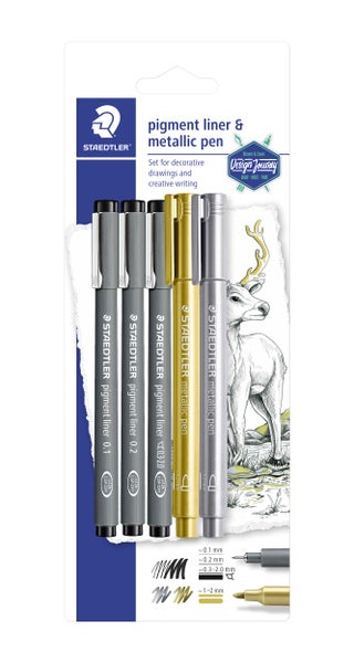 STAEDTLER Fineliner pigment liner 308 + 2 metallic pen, 5er Set