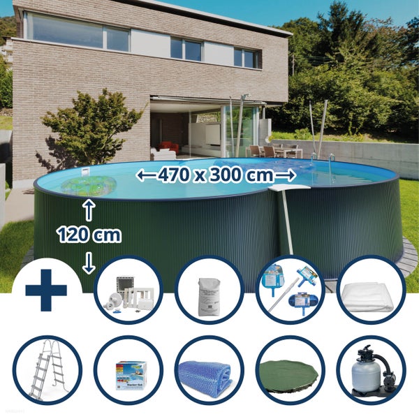Stahlwandpool Set achtform 470x300x120cm, Stahl 0,4mm anthrazit, Fol. 0,4mm blau