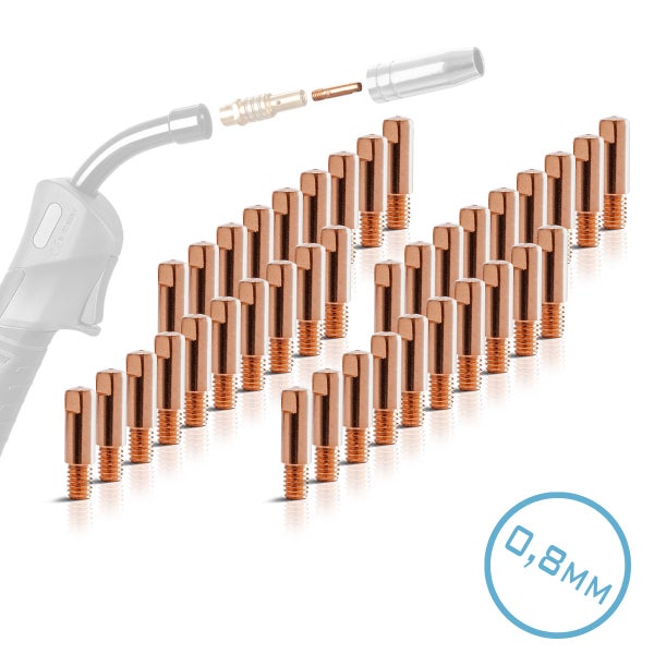- Aus reinem Kupfer gefertigt garantieren die Stromkontaktdüsen hohe Standzeiten, einen kontinuierlichen Schweißstrom und einen stabilen Lichtbogen.