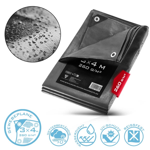 STAHLWERK Abdeckplane mit Ösen 3 x 4 m 260 g/m² wasserdichte Schutzplane