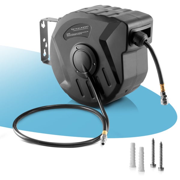 - Der hochwertige STAHLWERK Druckluftschlauch Automatik-Aufroller mit 10+1 m Länge arbeitet mit einem Betriebsdruck von bis zu 8 Bar und verfügt über eine Standard-Schnellkupplung (Nennweite 7,2 mm) mit praktischer Snap-Funktion für eine schnelle und unkomplizierte Inbetriebnahme.