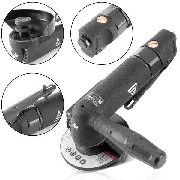Der robuste und leistungsstarke Druckluft-Winkelschleifer arbeitet mit 11.000 U/min und eignet sich sehr gut für den professionellen Einsatz in der Kfz-Werkstatt, im Maschinenbau oder in der Industrie. Auf der Werkzeugaufnahme können Schleif- und Schruppscheiben mit einem Durchmesser von 100 mm befestigt werden. Das Gehäuse des Druckluft-Trennschleifers ist aus schlagfestem Stahl-Guss gefertigt. Mit dem am Griff montierten Kontrollhebel lassen sich Drehzahl und Luftmenge gezielt regulieren. So wird sicheres und präzises Arbeiten ermöglicht. Die hochwertige Verarbeitung des Winkelschleifers sorgt für hohe Standzeiten und garantiert eine lange Werkzeugverfügbarkeit.