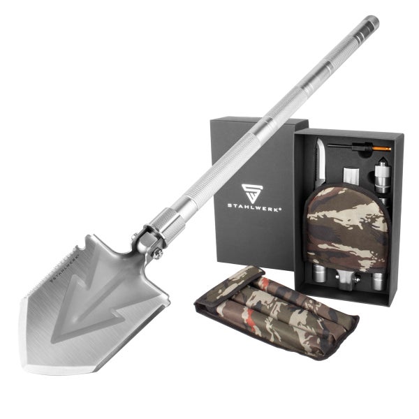 - Das STAHLWERK Multitool besteht aus Spaten, Multifunktions-Messer, Säge, Notfallhammer und Signalpfeife mit Feuerstahl sowie einem hochwertigen Transportschutz.
