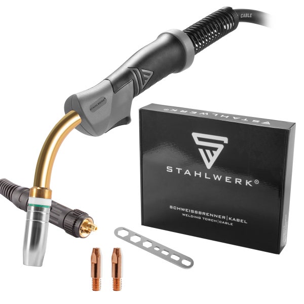 - Schweißbrenner und Schlauchpaket sind perfekt abgestimmt auf STAHLWERK MIG MAG Schweißgeräte, eignen sich aber auch für Fremdfabrikate mit technischer Übereinstimmung.