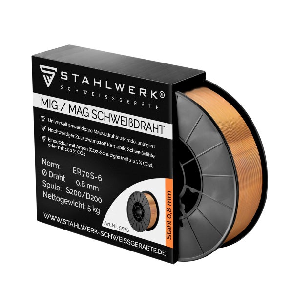 STAHLWERK MIG/MAG Schweißdraht ø 0,8 mm, Stahl SG2 ER70S-6, auf 5 kg S200/D200 Drahtrolle mit 50 mm Dorn