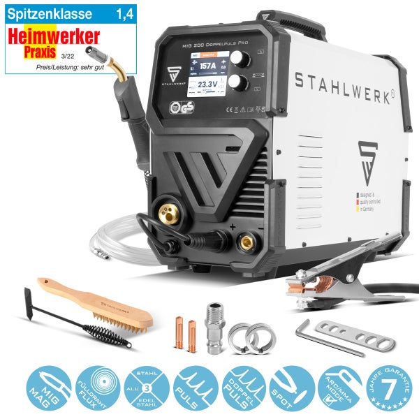 - Das leistungsfähige STAHLWERK MIG 200 Doppelpuls Pro Schutzgas-Schweißgerät verfügt über eine komfortable Puls- sowie Doppelpuls-Funktion und arbeitet mit bis zu 200 Ampere.