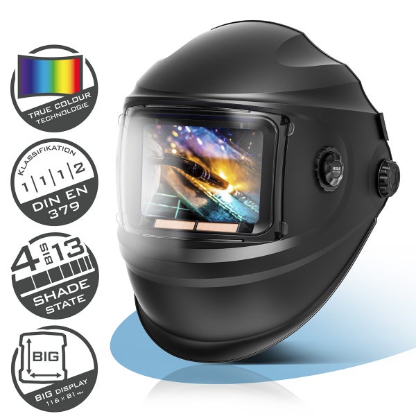 - Ausgestattet mit einer True-Colour-Filterkassette der neuesten Generation gewährleistet die Schweißermaske optimale Sichtverhältnisse und eine ausgezeichnete Echtfarbwiedergabe.