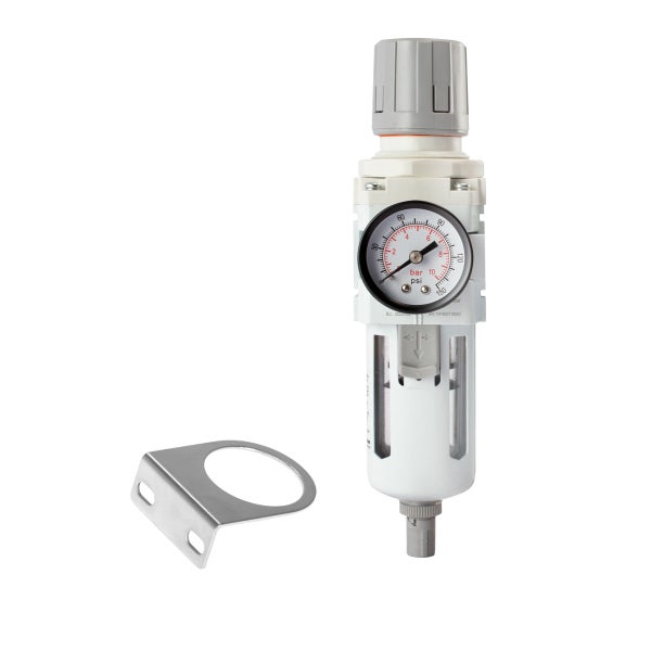 - Der Druckluftregler ist eine effiziente Wartungseinheit mit Filter und Wasserabscheider für den Einsatz an Kompressoren.