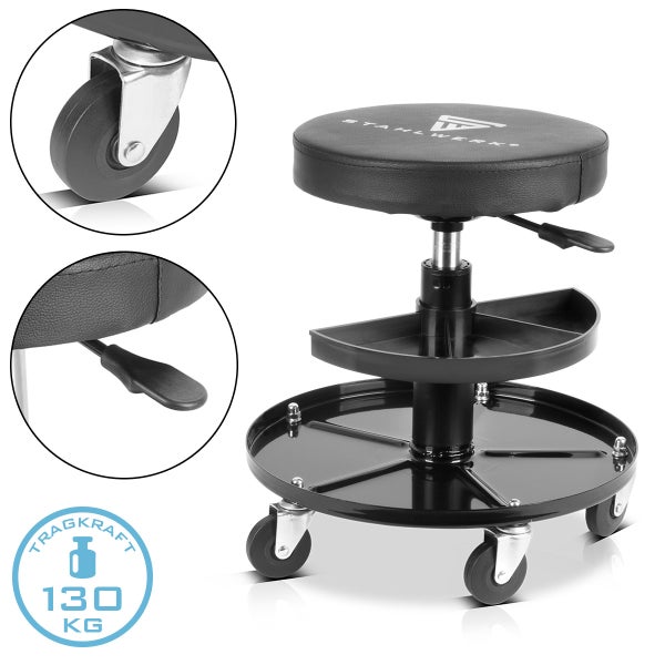 - Der robuste Rahmen aus verwindungsfreiem Stahl ist mit 130 kg extrem belastbar und dank der Leichtlauf-Lenkrollen ist der Werkstattsitz auch bei maximaler Belastung sehr leicht zu manövrieren.