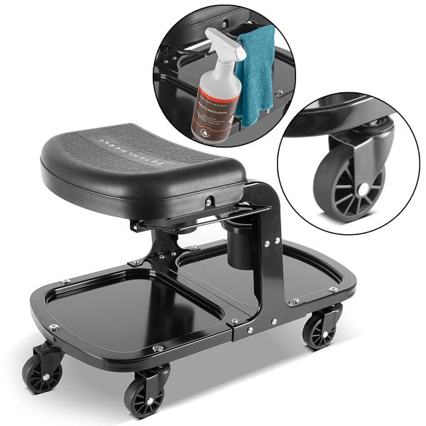 - Fahrbarer Werkstatt-Rollsitz mit zwei Dosen- bzw. Flaschenhaltern, großzügigen Ablagemulden, einem integrierten Werkzeughalter und einem einziehbaren Tuchhalter.