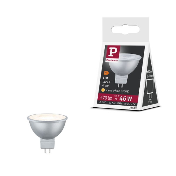 Der LED Glasreflektor mit 2700K, einer Leistung von 6,5W und 570lm sorgt für gerichtetes Licht in Pendelleuchten, Spots und Strahlern. Das Leuchtmittel passt in jede handelsübliche GU5,3 Fassung. Es gibt ausschließlich nach vorne Licht ab und setzt durch gezieltes Anstrahlen Bilder, Dekoration oder ganze Wandflächen in Szene. Die Paulmann LED-Lampen mit Eye friendly-Siegel bieten augenschonendes und komfortables Licht. Ob beim Arbeiten, Lesen oder Entspannen, die Lampen tragen zu besten Sehkomfort bei.