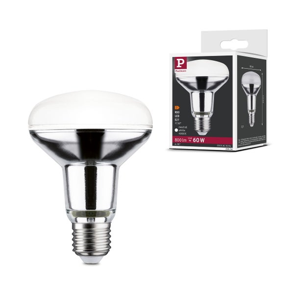 Die Vollglas Reflektorlampe R80 mit 4000K, einer Leistung von 10W und 800lm sorgen für gerichtetes Licht in Pendelleuchten, Spots und Strahlern. Die Lampe passt in jede handelsübliche E27 Fassung. Sie geben ausschließlich nach vorne Licht ab und setzen durch gezieltes Anstrahlen Bilder, Dekoration oder ganze Wandflächen in Szene. Die Paulmann LED-Lampen mit Eye friendly-Siegel bieten augenschonendes und komfortables Licht. Ob beim Arbeiten, Lesen oder Entspannen, die Lampen tragen zu besten Sehkomfort bei.