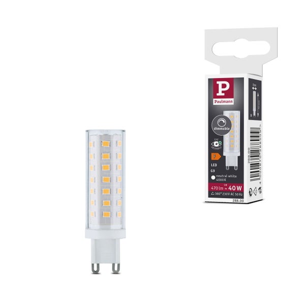 Diese dimmbare G9 LED-Stiftsockellampe aus Kunststoff mit 470 lm ist klein, kompakt und leistungsstark und eine gute LED-Alternative zu Halogenlampen. Von einem Austausch profitiert man gleich doppelt - neben dem deutlich geringeren Energieverbrauch, hat diese Stiftsockellampe auch noch eine wesentlich längere Lebensdauer als ihr Vorgänger. Dieses Leuchtmittel ist besonders gut für den Einsatz in kleinsten Leuchten oder Spotköpfen geeignet und schafft eine einwandfreie und gleichmäßige Lichtverteilung. Die Paulmann LED-Lampen mit Eye friendly-Siegel bieten augenschonendes und komfortables Licht. Ob beim Arbeiten, Lesen oder Entspannen, die Lampen tragen zu besten Sehkomfort bei.