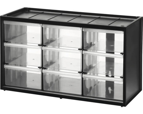 Produktstärken:|9 Bin System (40709)|Kleinteilemagazin mit 9 transparenten Einschüben|robuster und bruchfester Kunststoffrahmen|schlagfeste Einschübe aus transparenten Polypropylen für gute Sichtbarkeit des Inhalts|Kleinteilemagazine können ineinander gesteckt werden für ein flexibles, modulares Aufbewahrungssystem|geeignet zur Wandmontage