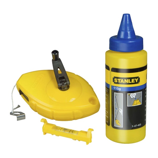 Schlagschnurautomat Stanley®, 115g Kreide und Schnurwasserwaage im Set Bequemes Verstauen des Hakens im Gehäuse Schlagfestes Gehäuse aus ABS Kunststoff Kurbel kann in das Gehäuse geklappt werden Schiebefach für leichtes und schnelles Befüllen Edelstahl Endhaken für Widerstandsfähigkeit und Rostschutz Neues ergonomisches Design Für 30 m Schnur