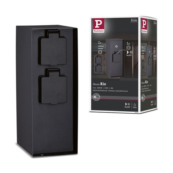 Die Steckdosensäule Rio mit Dämmerungssensor dient als Stromverteiler für den Außenbereich. Dank IP44 Spritzwasserschutz und Schutzkontaktsteckdosen eignet sie sich perfekt zur Steuerung des Gartenlichts. Die Steckdosen auf der Rückseite haben eine Dauerspannung, während der Sensor die Steckdosen auf seiner Seite steuert.