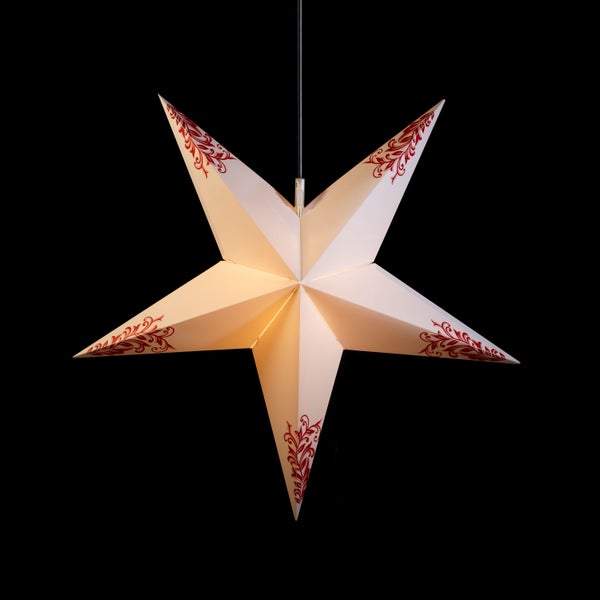 - Der Sterntaler Dekostern ist ein 60 cm großer Faltstern, weiß mit roten Ornamenten.