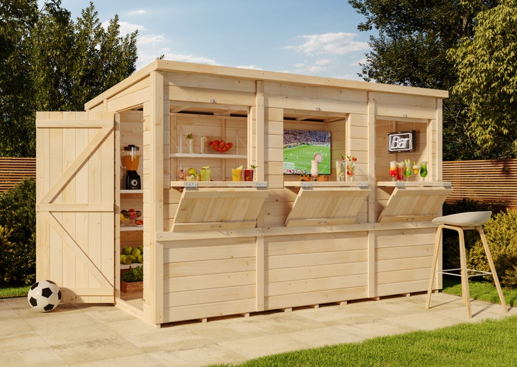 Ganz neu in der Storehouse-Serie präsentieren wir die ultimative Partyhütte Philipp XL - Perfekt für alle Arten von Feiern wie Geburtstage, Hochzeiten, Jubiläen oder einfach nur, um an lauen Sommerabenden mit Freunden im eigenen Garten gemeinsame Zeit zu genießen. Besonders zur EM ist die Partyhütte ideal, da sie zur Bar umfunktioniert und mit einem Fernseher ausgestattet werden kann, um ein privates Public Viewing im Garten zu ermöglichen. Später kann sie einfach als Geräteschuppen genutzt werden.Die charmante Holzhütte mit den Maßen von ca. 306 x 186 cm präsentiert sich mit modernem Pultdach und Einzeltür und bietet dem Barkeeper oder der Barkeeperin ausreichend Platz zum Mixen von leckeren Cocktails und Drinks.Die Baröffnungen können mit einem einfachen Handgriff geöffnet werden und verwandeln sich dank ausgeklügelter Technik in stilvolle Bartheken und Abstellflächen für Snacks, Gläser und Getränke aller Art.Artikeldetails:-Außenmaß: ca. 306,8 x 196,2 cm-Sockelmaß: ca. 306 x 186 cm-Grundfläche: ca. 5,7 m²- Gesamthöhe: 202 cm-Dachform: Pultdach-Packmaße: 210 x 120 x 65 cm-Wandstärke: 12 mmIm Lieferumfang enthalten:Storehaus Philipp XL -(ohne Dekoration und Regal) mit Pultdach, Einzeltür, Theke und FußbodenLieferung: