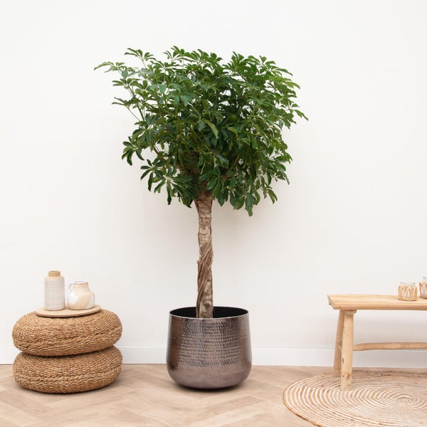 Aussehen der Pflanze: Die Schefflera, auch bekannt als Strahlenaralie, hat elegante, handförmige Blätter, die aus mehreren kleinen, ovalen Blättchen bestehen. Die glänzend grünen Blätter verleihen der Pflanze ein üppiges, tropisches Aussehen.