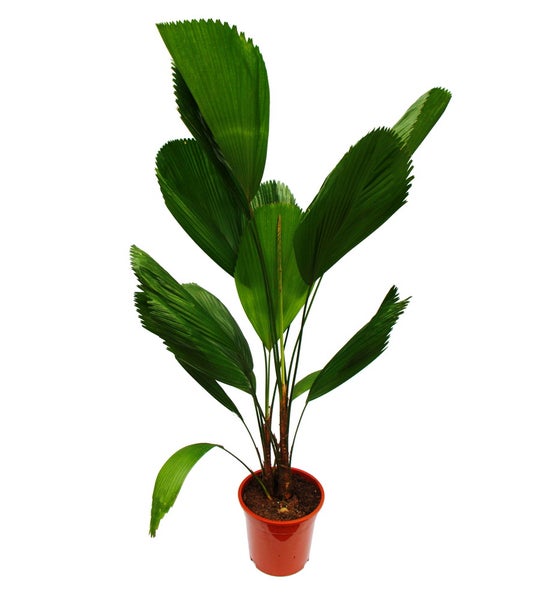 Licuala grandis, auch bekannt als Vanuatu-Strahlenpalme, ist eine außergewöhnliche Zimmerpflanze, die durch ihre unverwechselbaren, fächerförmigen Blätter besticht. Ihre symmetrische Blattstruktur und ihre beeindruckende Größe von ca. 110 cm machen sie zu einem perfekten Solitär für große Räume oder lichtdurchflutete Ecken. Diese Palme bringt einen Hauch von Exotik in Ihr Zuhause und verleiht jedem Raum eine elegante und zugleich tropische Atmosphäre.