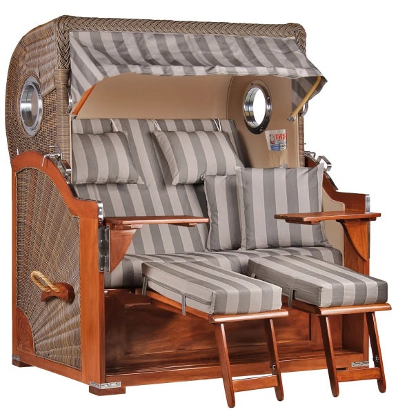 Im behaglichen Strandkorb lässt es sich wunderbar relaxen. Sie können Wärme und Wind genießen und sich gleichzeitig blickgeschützt in der Sonne räkeln. Der Strandkorb Westerland verbreitet wohltuende Urlaubsatmosphäre. Die Beine hochlegen, die Kaffee- oder Teetasse in Reichweite finden, so können Sie sich gemütlich ausruhen. Ob fürs Lesevergnügen oder fürs Mittagsschläfchen, die Volllieger - Funktion unserer Luxus - Strandkörbe lädt Sie auch dazu ein, sich bequem auszustrecken. Edles Mahagoni verleiht diesem luxuriösen Relax - Mobiliar sein edles Flair. Das hochwertige Echtholz und das erstklassige Design verwandeln Ihre Terrasse, Ihren Garten oder Ihren Balkon in eine Oase der Entspannung. Der maritime Stil mit Bullauge und Markise verbreitet ein repräsentatives Ambiente von Noblesse und Eleganz.