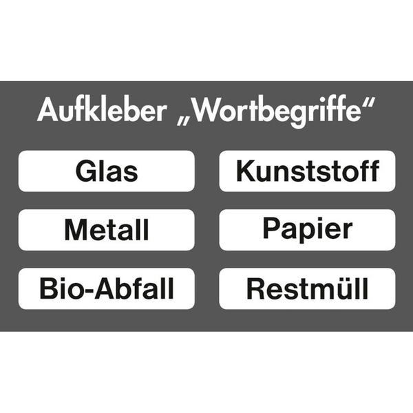 Dieser Artikel kann leider nicht nach BeNeLux und Österreich geliefert werden. Aufkleber-Set, 6 Stück mit Wortbegriffen Glas, Kunststoff, Metall, Papier, Bio-Abfall und Restmüll. Farbgebung: schwarz/weiß