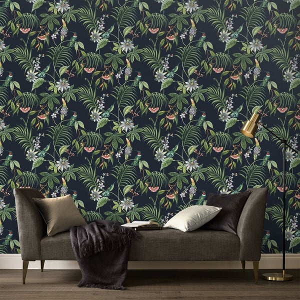 Diese stilvolle Adilah Floral Tapete wird in den meisten Räumen Ihres Zuhauses einen großen Eindruck hinterlassen. Das detaillierte Design zeigt wunderschöne Kolibris inmitten einer Passionsblume und Blättern in reichen, juwelenartigen Farbtönen von Orange, Rot, Grün, Blau und Gelb. Alles auf einem matten, dunkelblauen, fast schwarzen Hintergrund mit einer leicht strukturierten Oberfläche.