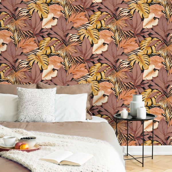 Bringen Sie einen Hauch von Natur ins Haus mit der grün-rosa Tapete Indra. Eine Kombination aus einem trendigen matten Hintergrund und einer tonalen tropischen Blattsilhouette für einen eleganten, einfachen und modernen Look für Ihre Wände.