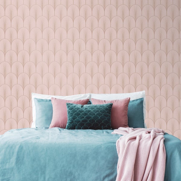 Diese stilvolle, vom Gatsby inspirierte Art-Déco-Tapete bietet ein Retro-Muster mit einem modernen Twist. Das vom Art Deco inspirierte Bogenmuster besteht aus einem opulenten Metallic-Overlay auf einem farbigen Hintergrund. Ideal für Wohnzimmer, Schlafzimmer und Flure.